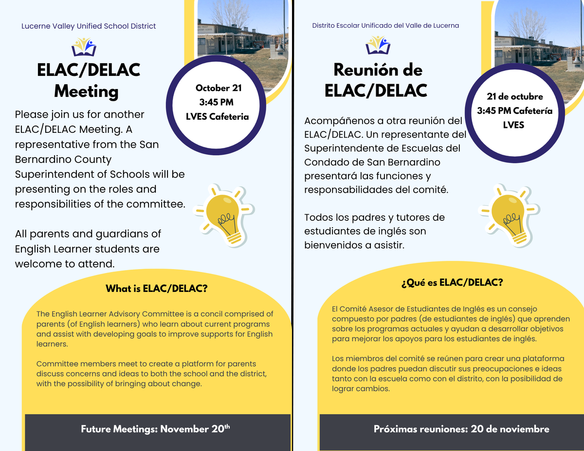 ELAC/DELAC will hold its next meeting on Tuesday, October 21 at 3:45 p.m. in the LVES Cafeteria. Read the flyer in English, Spanish and Thai for more information.